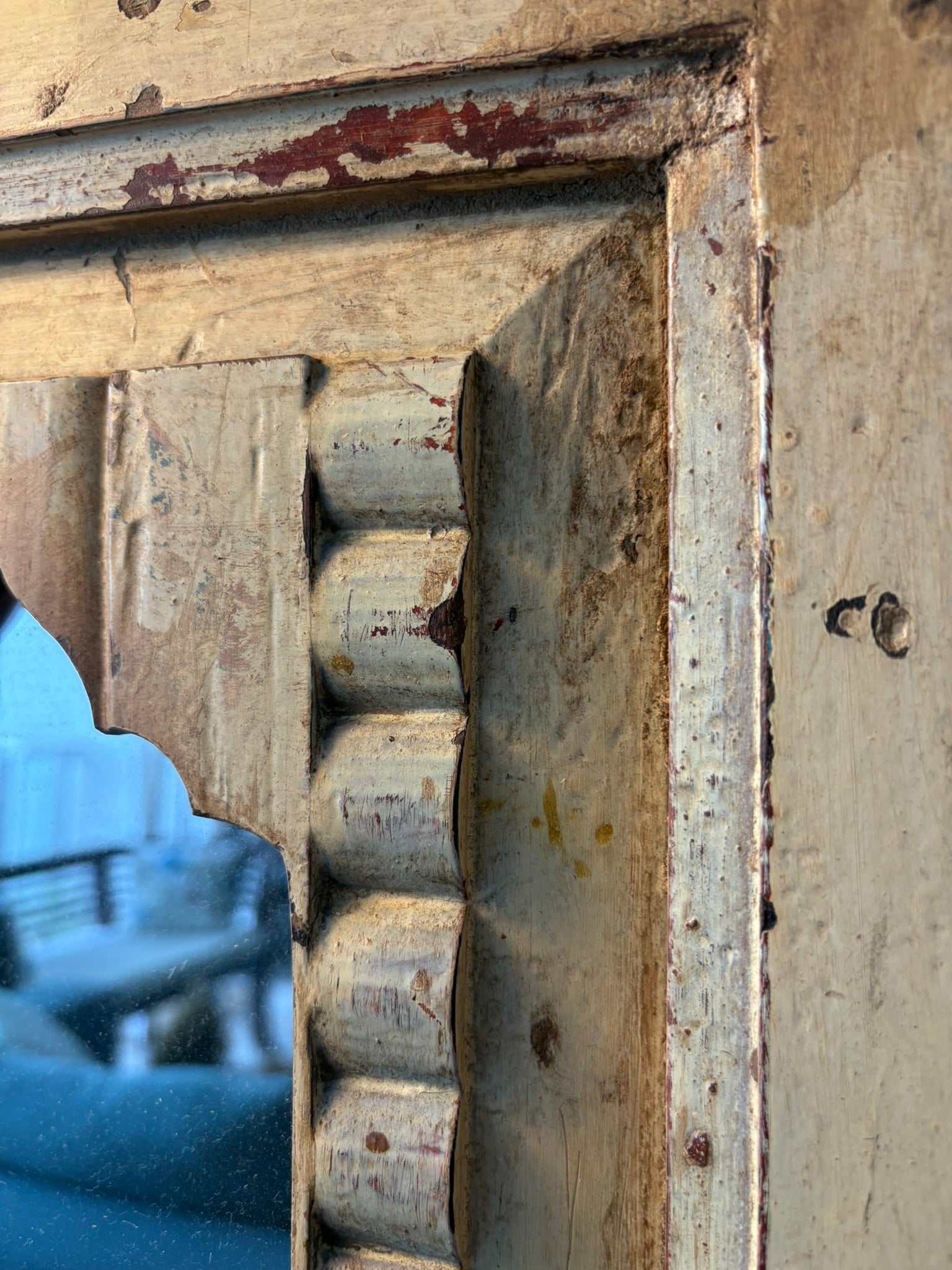 Its distinctive charm lies in the two intricately hand-carved panels along the inner frame, enhancing its design appeal. Featuring a naturally aged patina, this mirror incorporates elements from antique doors and windows, bringing a sophisticated touch and timeless character to any room.
