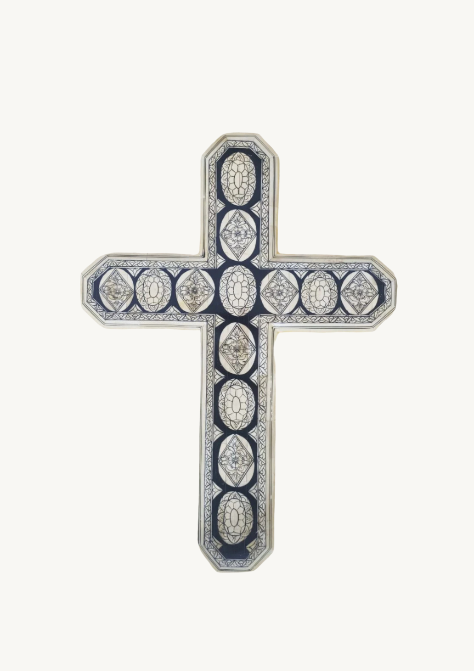 This exquisite Cross boasts a stunning inlay design, handcrafted from solid wood and intricately adorned with pieces of bone and resin for a striking juxtaposition. Artisans have then drawn intricate designs on the bone to add to this its allure. Display this beloved masterpiece on your wall for a touch of elegance.