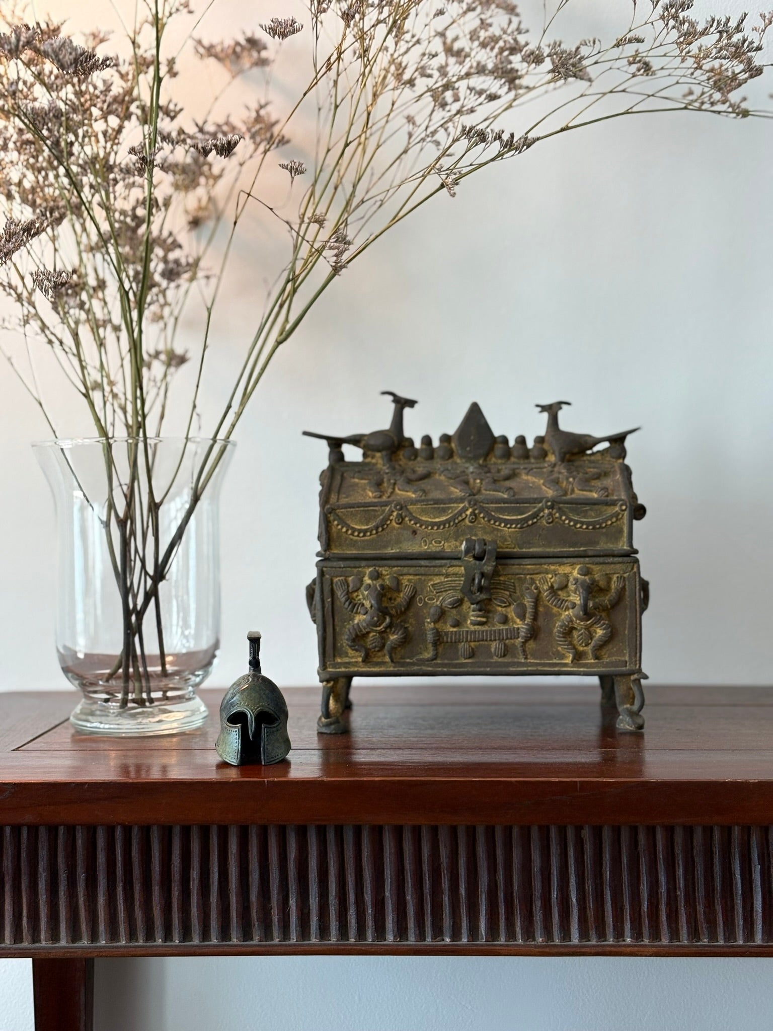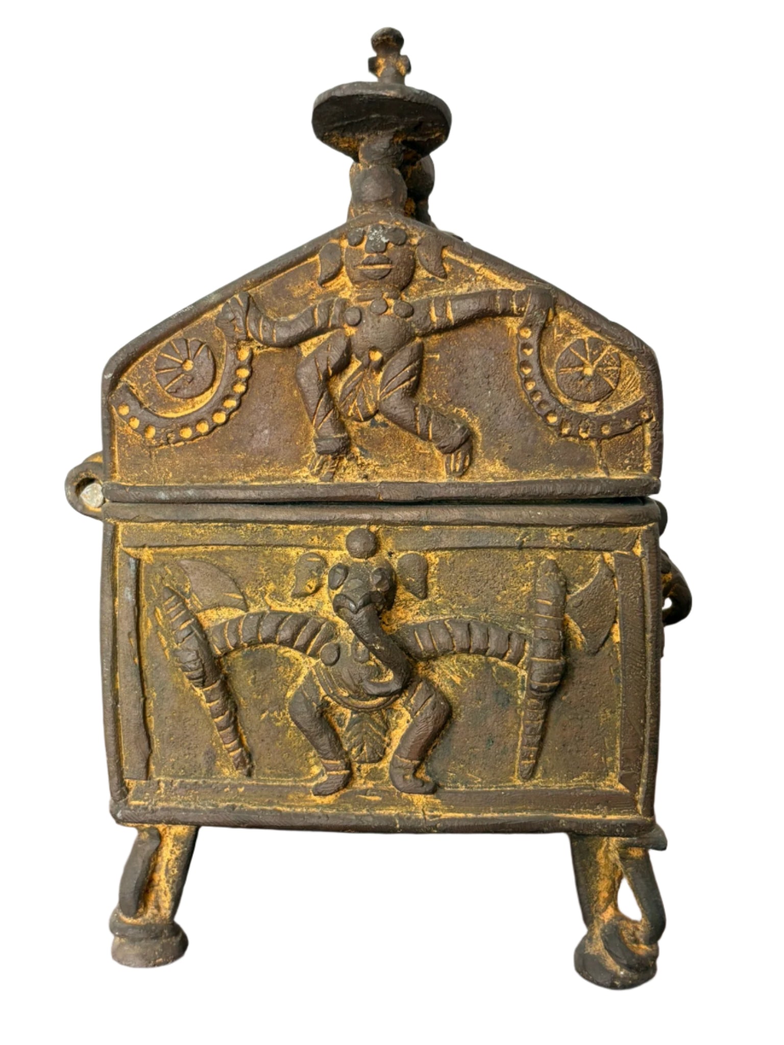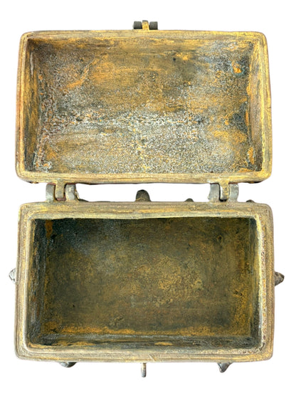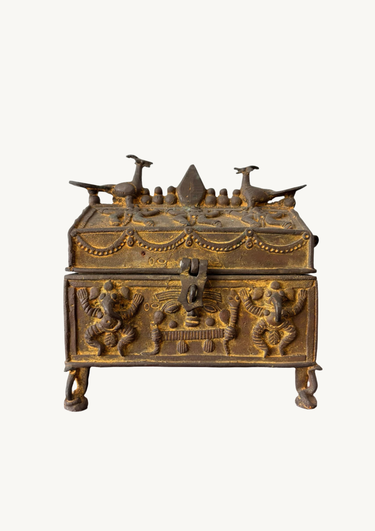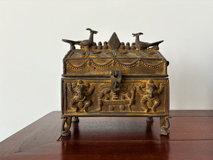 Ornately crafted figures adorn the entire box, while two vigilant birds act as loyal guardians perched on top. Supported by four intricate yet sturdy legs, this substantial box weighs an impressive 6kg. We have preserved the box's authentic and aged appearance. This box was presumably used to keep money safe.
