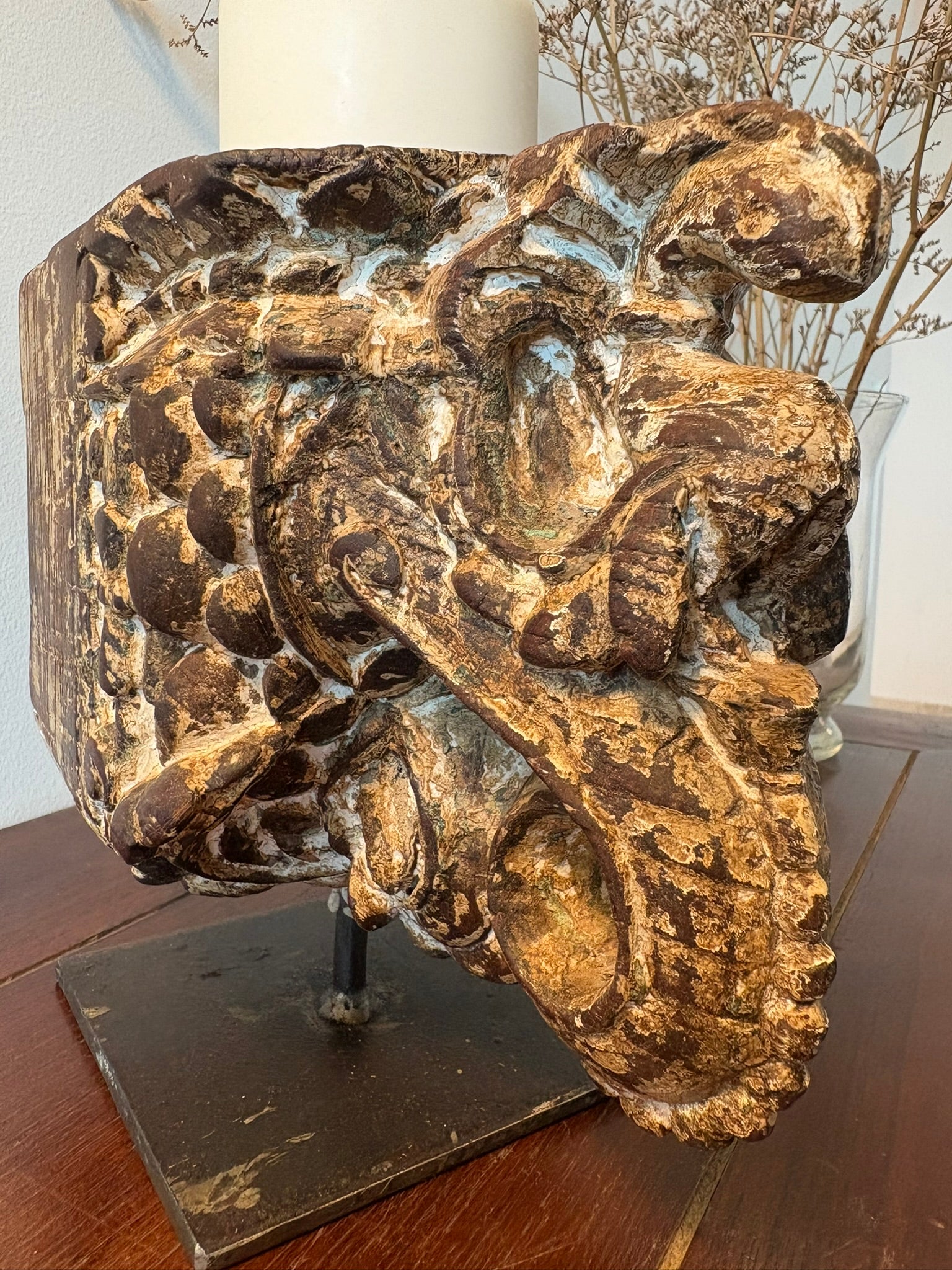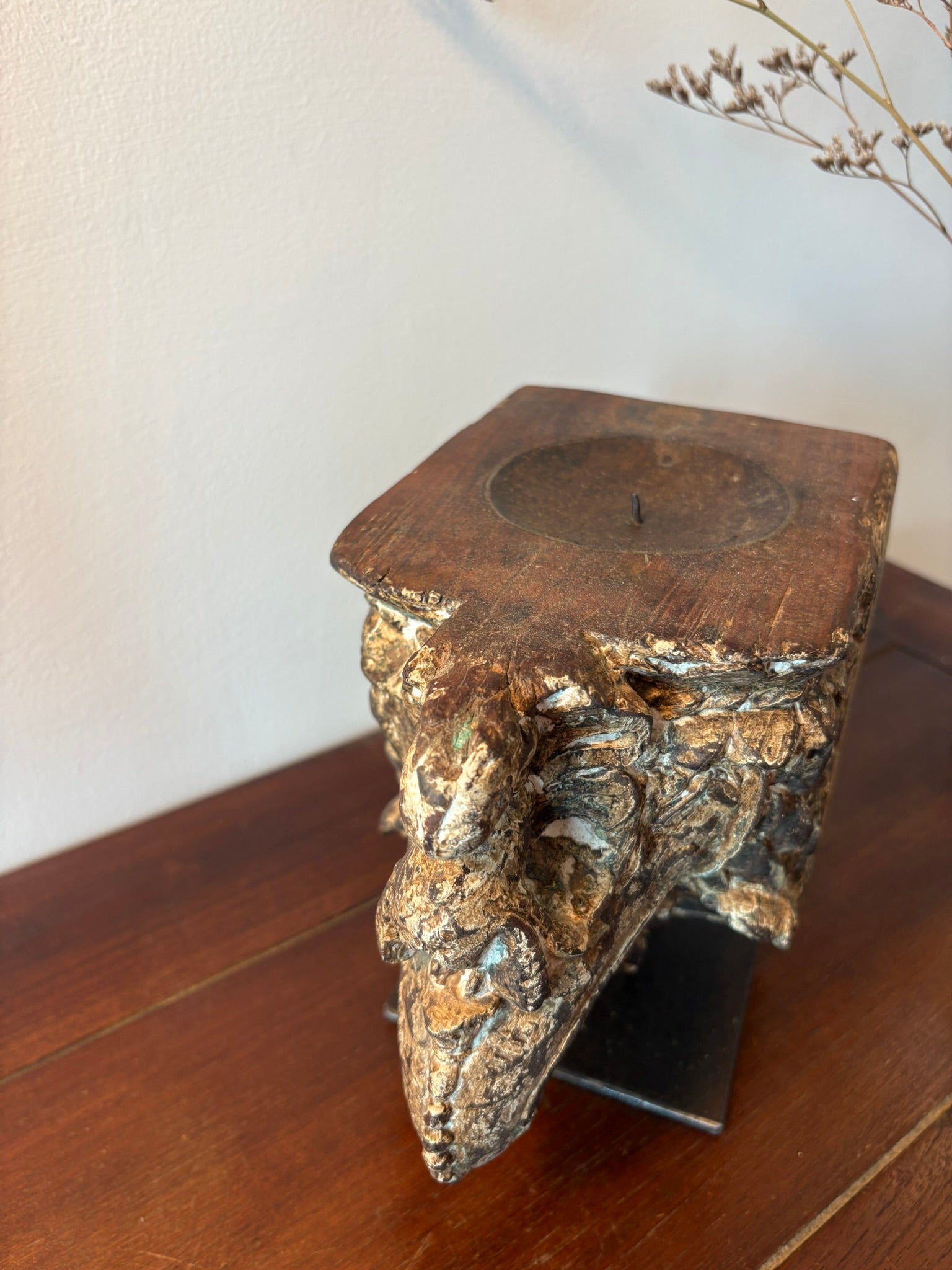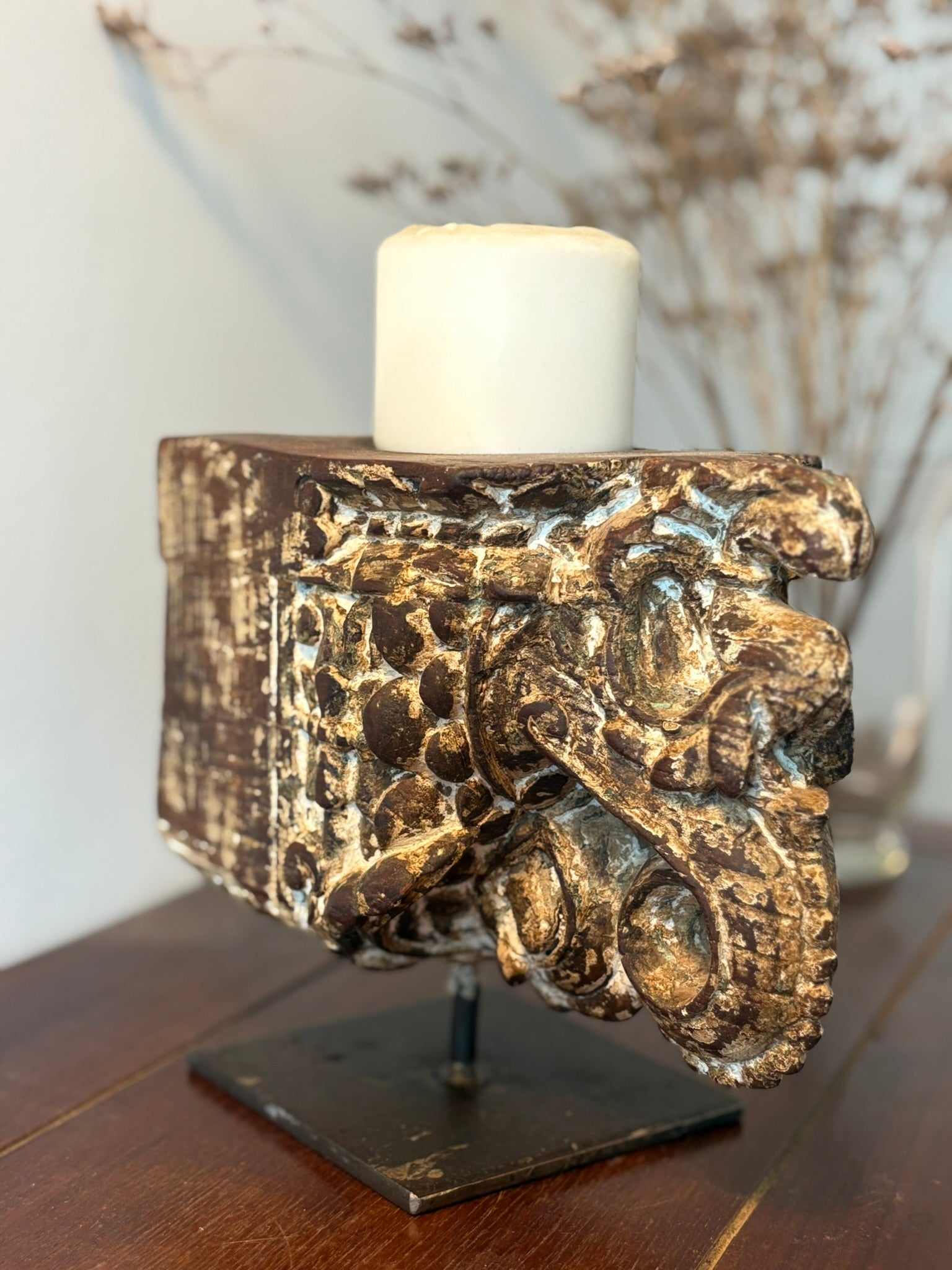 Crafted from reclaimed parts of a vintage pillar, this exquisite candle base boasts the timeless beauty that only nature can bestow. Adorned with delicate ethnic motifs and meticulously hand-carved, it depicts a graceful bird with outstretched wings culminating in a coiled tail. . It holds the secrets of a bygone era within its alluring embrace. It is made of solid old wood and weighs a hefty 3 kilos.