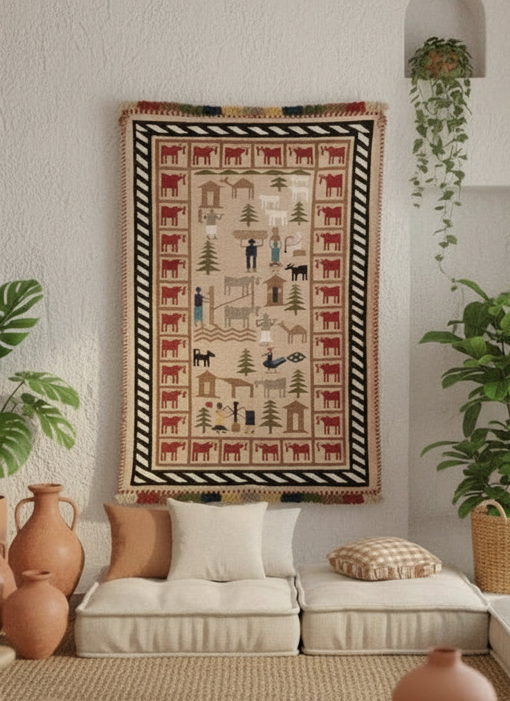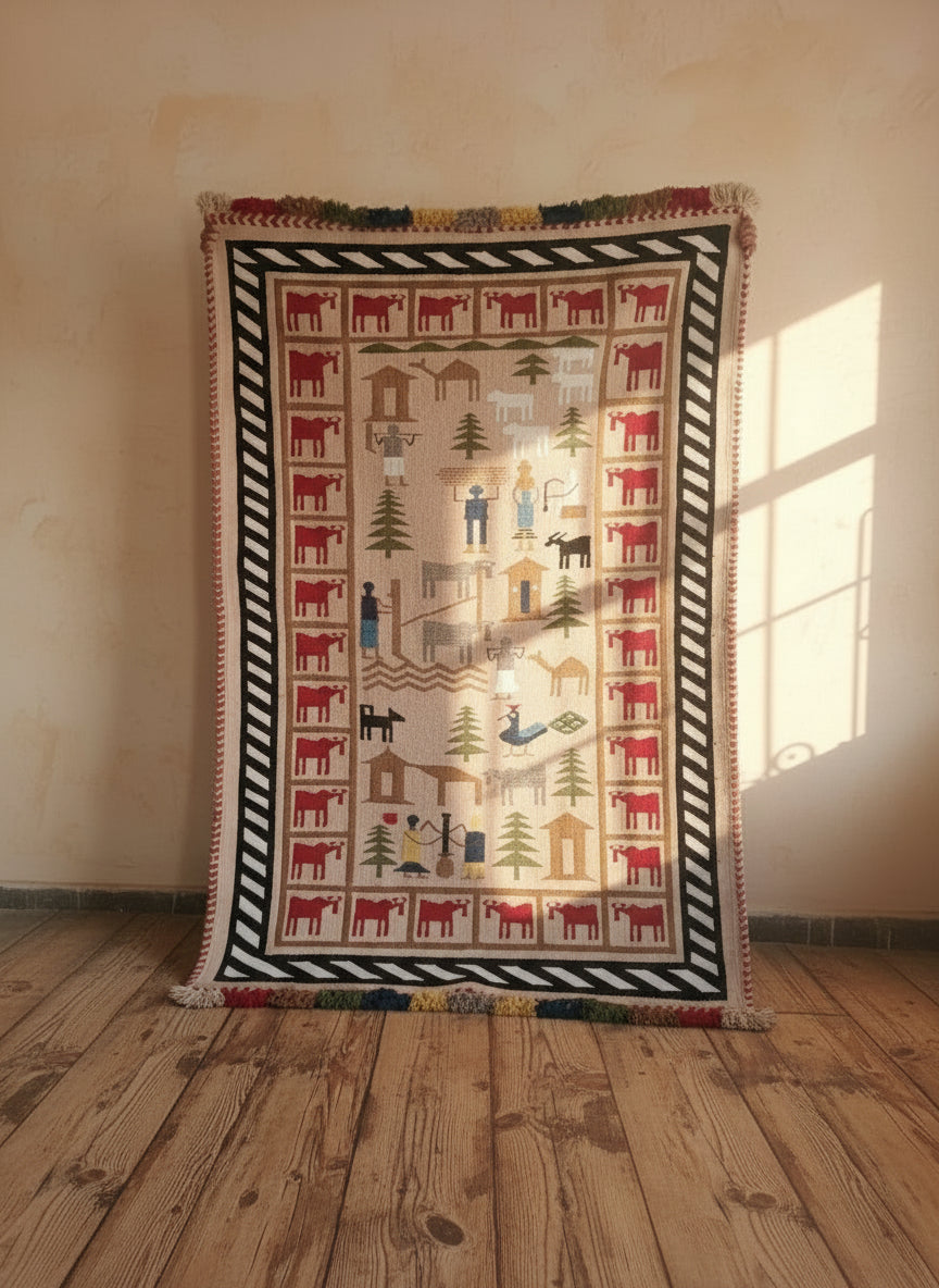 The border also tells the story. Cows walk around the rug like a circle, keeping everything inside. The blue steps on the side and the red, green, and blue tassels give it a finish. Nothing is extra - each animal, tree, hut and bird is part of the same world, woven slowly by hand.