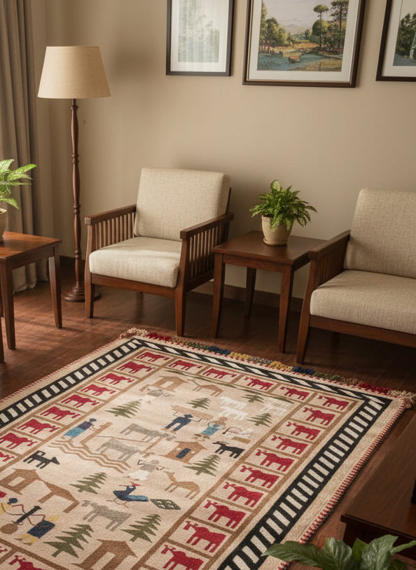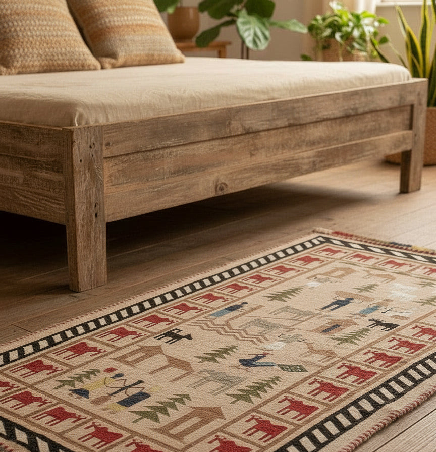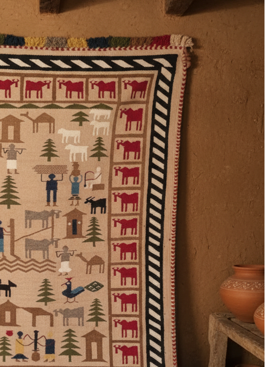 Traditionally woven in earthy tones—black, brown, white, ochre—artisans today also use natural vegetable dyes to introduce vibrant colours while maintaining authenticity. The motifs draw from the world around them: desert landscapes, village life, animal forms, rituals, mud-wall patterns, and memories carried across generations. Every carpet becomes a living narrative of Kutch.