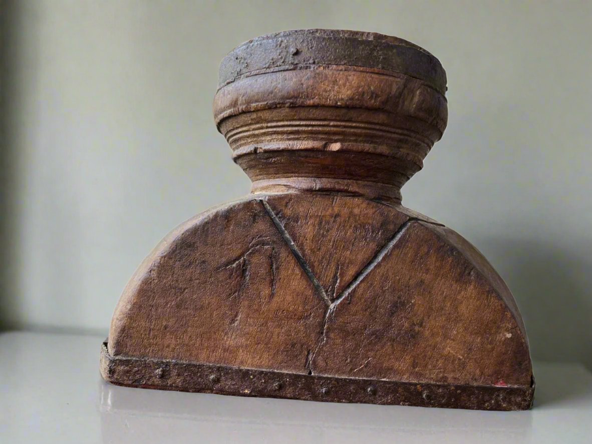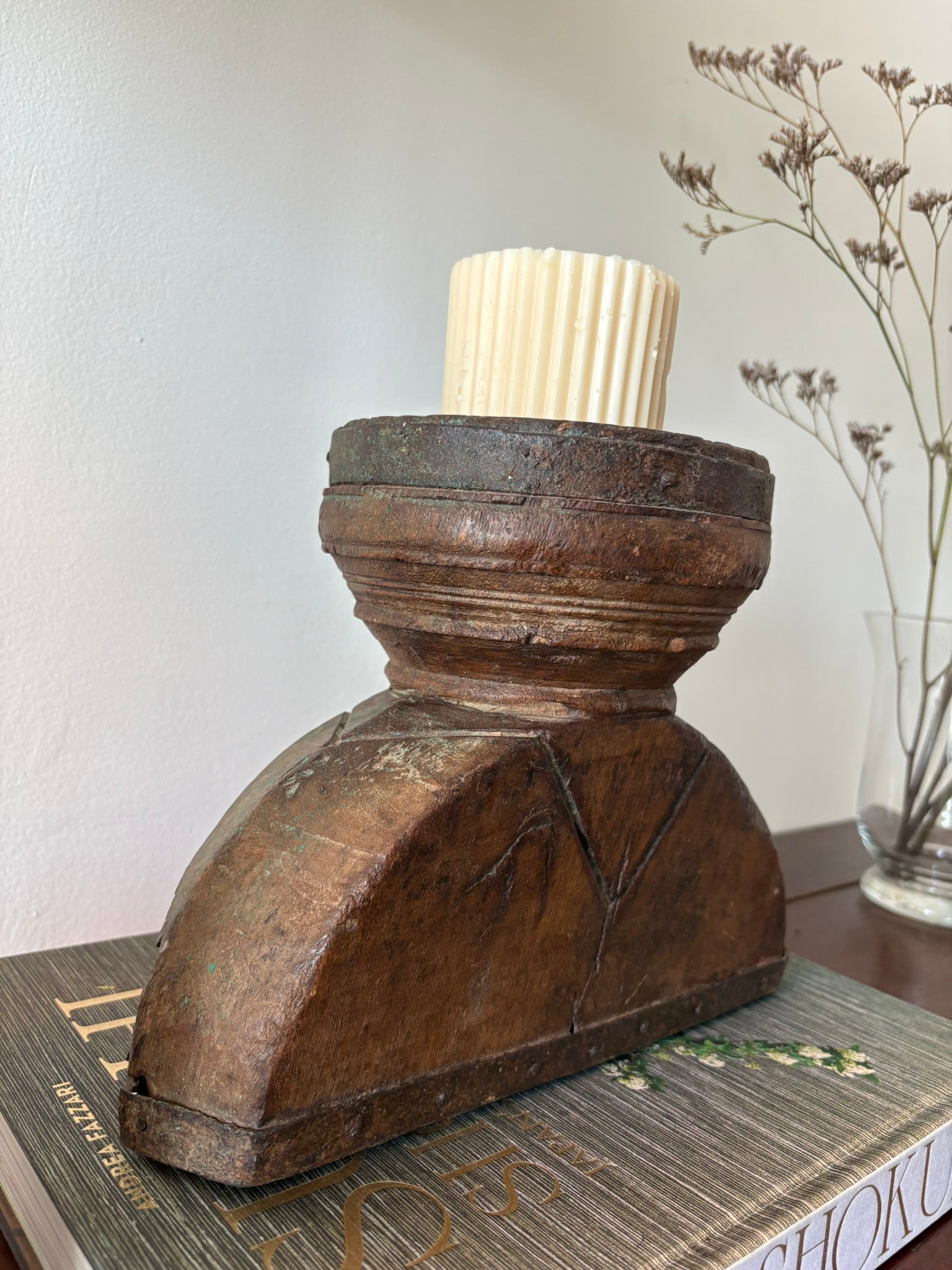 The Arya Vintage Candle Holder is a unique piece made from a traditional agricultural tool called a "Bijni." Originating in the 19th century, this tool was used by Indian farmers to distribute seeds on their farms.